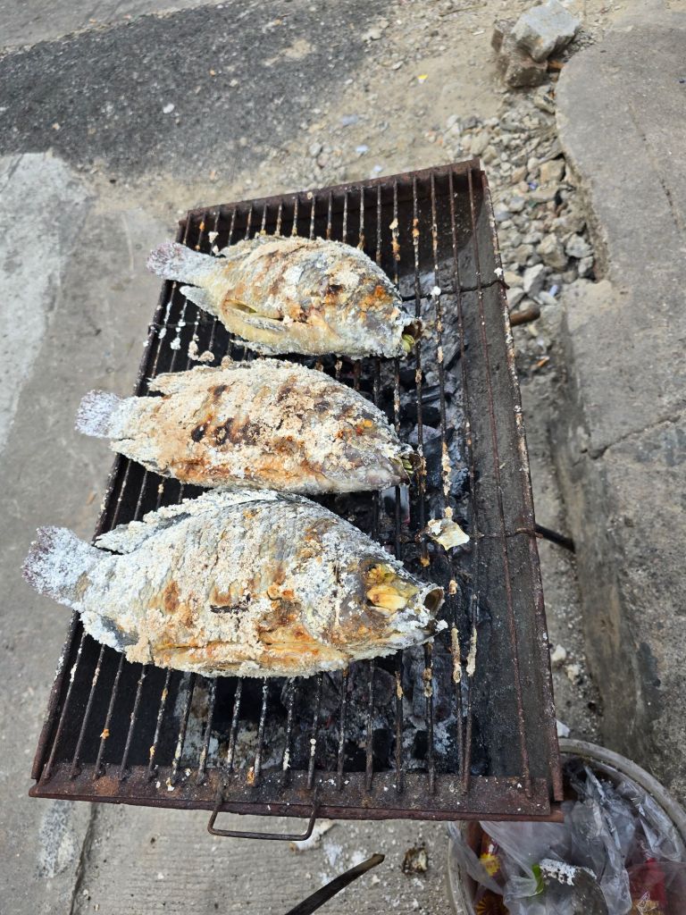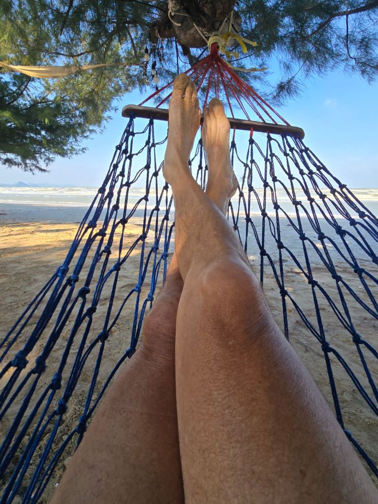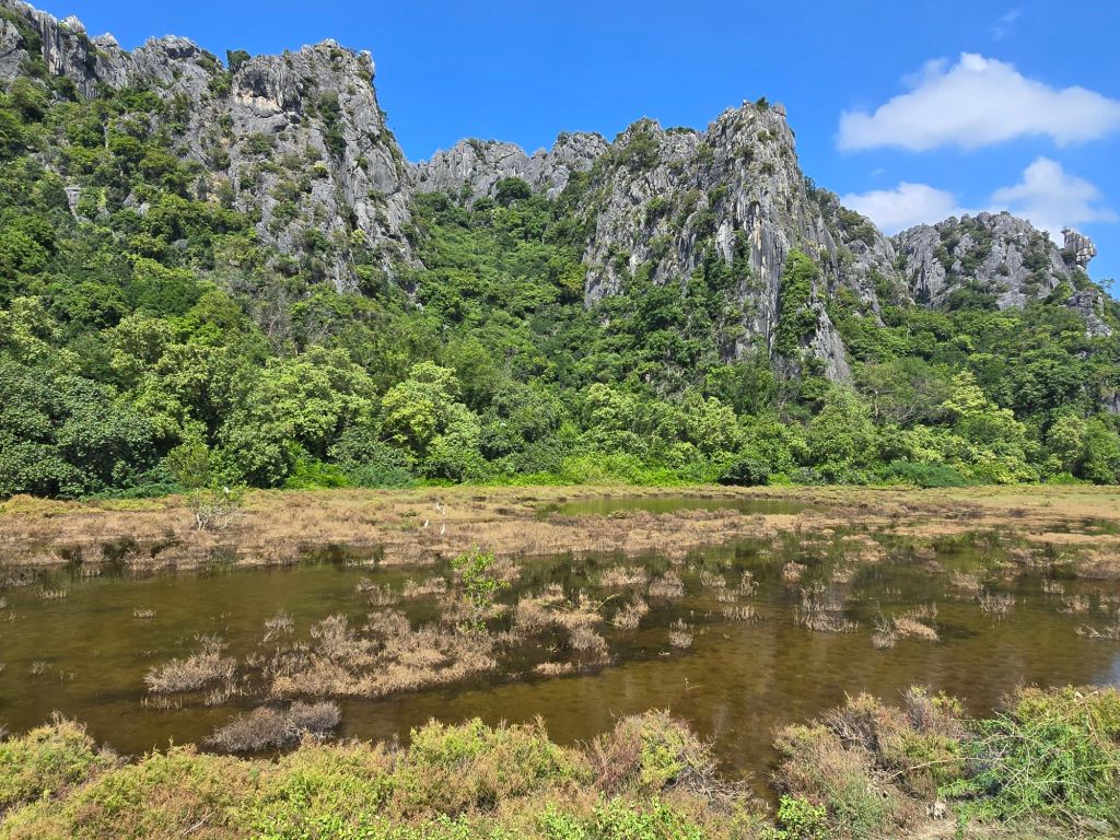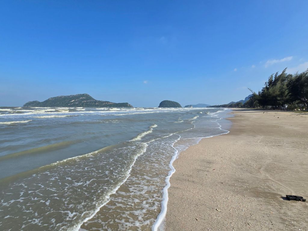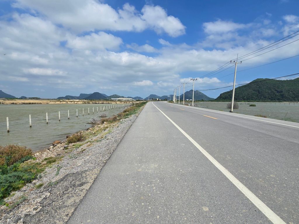 Dieser Tag hat angefangen wie der gestrige geendet hat, nämlich mit kräftigem Gegenwind. Nach ca. 8 Kilometern musste ich über einen Damm fahren, der etwa zwei Kilometer lang war und dort blies der Wind von der Seite. Durch die Fahrradtaschen am Velo bekommt der Wind so viel Angriffsfläche, dass ich acht geben musste, nicht von der Strasse geweht zu werden. Zum Glück verlief meine Etappe ein paar Kilometer auf dem Highway 4. Dort ist man dem Wind weniger ausgesetzt und die an einem vorbeifahrenden Autos und Lastwagen erzeugen einen Sog, der einen zieht. Die Landschaft war recht abwechslungsreich. Nach dem Khao Sam Roi Yot Nationalpark mit Höhlen, Bootsfahrten und verschiedenen Möglichkeiten, die Natur zu entdecken, kam eine riesige Ebene mit Garnelenfarmen. Dort war der Wind besonders heftig, da es keine Bäume oder Hecken hat, die den Wind bremsen könnten. Zum Teil fuhr ich nur noch mit 8km/ h. In Sam Roi Yot angekommen, habe mir nach dem Einchecken in der Unterkunft ein Bier geholt und mich erstmals am Strand in eine Hängematte gelegt.
