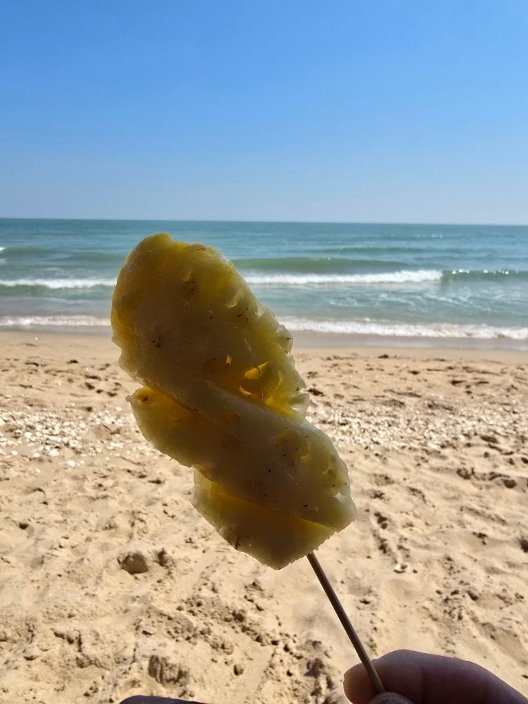 Cha-Am ist ein bekannter Touristenort in Thailand. Durch eine Strasse vom Strand getrennt liegen viele Restaurants, Bars und Hotels. Mein Tag fand vor allem am Strand statt. Für umgerechnet 2.50 CHF habe ich mir einen Liegestuhl unter einem Sonnenschirm gemietet. Zum Mittagessen gab es eine frische Ananas von einer Strassenhändlerin. Sie wollte wissen, woher ich komme und wie lange ich in Cha-Am bleiben werde. Als ich ihr erklärte, dass ich nur einen Tag hier bleiben werde und dann mit dem Velo weiter Richtung Bangkok fahre, hat sie mir noch drei Bananen geschenkt. Die geben Kraft meinte sie, sehr nett von ihr. Oder hatte sie wohl Mitleid mit mir?