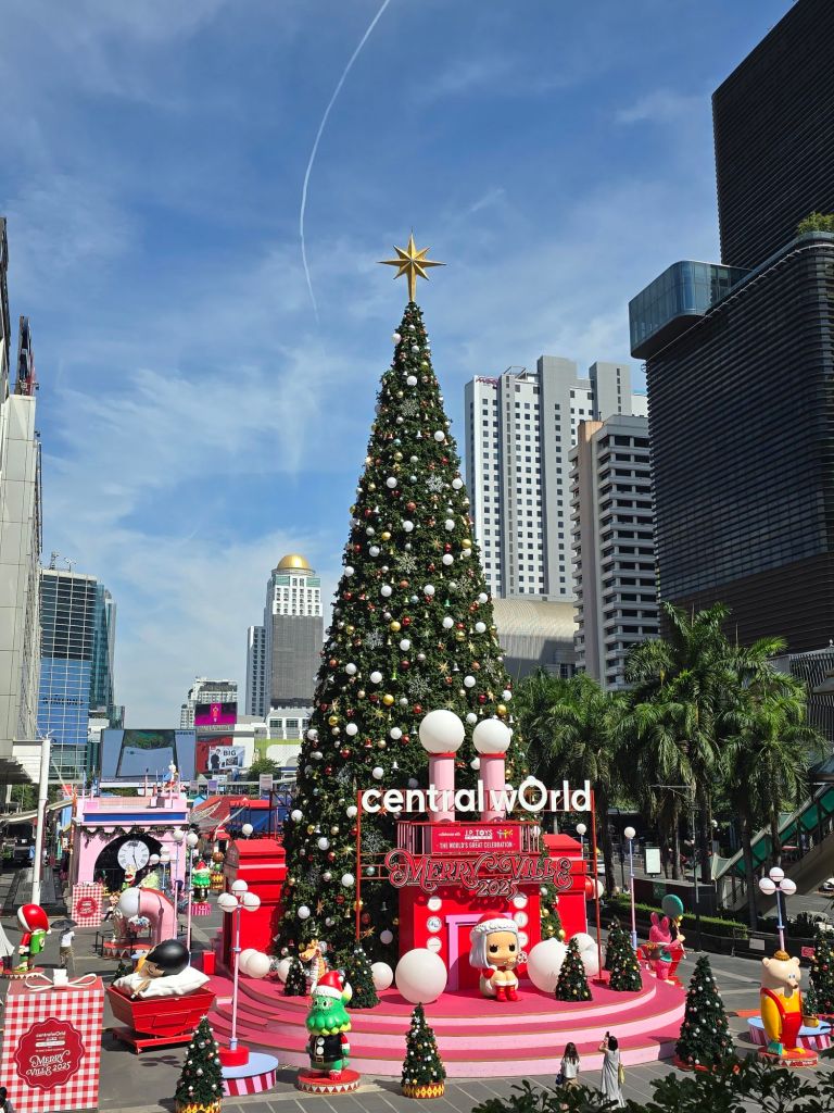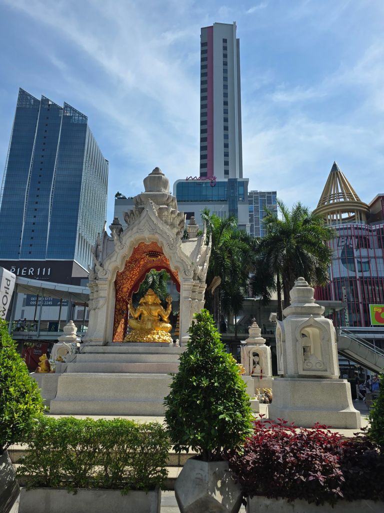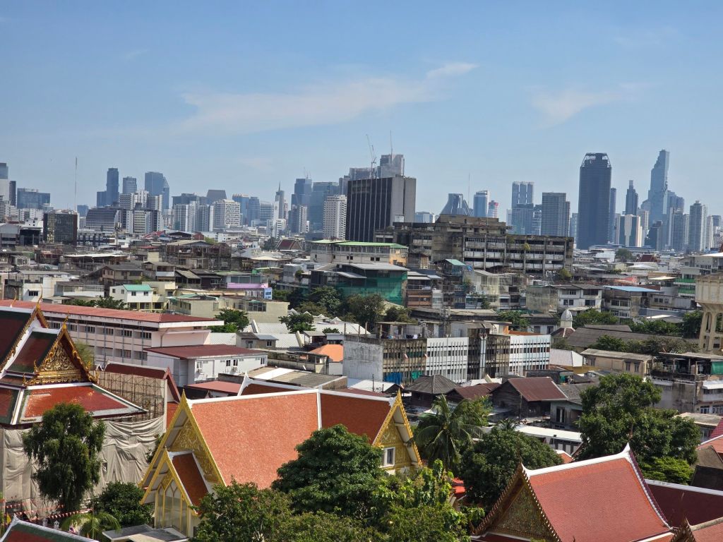 Der Königspalast BangkoksMein Tuk Tuk Fahrer mit VIP SitzenModerne Bauten mit BegrünungDie Eisenbahn fährt mitten durch die Stadt und alles steht.Thailändische WeihnachtsdekoAlt und neu nebeneinanderIch weiss nicht, was man sich wünschen kann, wenn man den Gong schlägt.Die Sky Line vom Golden Mount ausTempel am Golden Mount