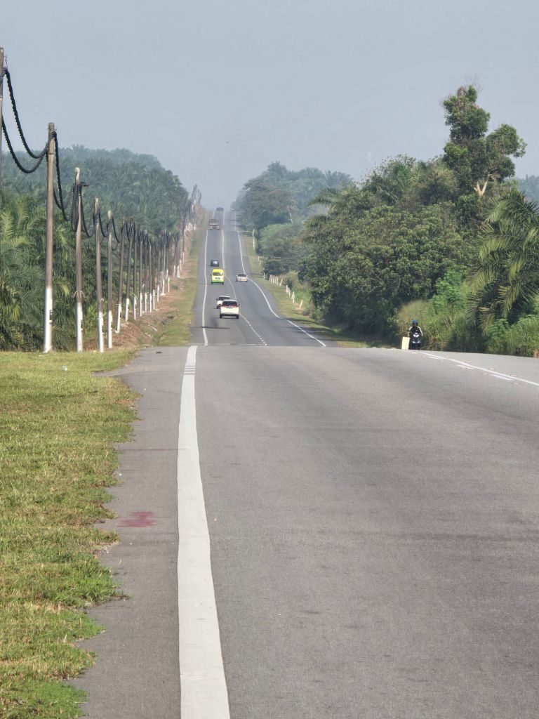 Diese Etappe war ganz anders zu fahren als die gestrige: weniger Verkehr, weniger Lastwagen und gute Strassen. Wobei man die Fahrbahn immer im Auge behalten muss, denn es gibt Löcher im Belag oder das Gegenteil, nämlich Wölbungen. Diese hat’s vor allem bei Übergängen zu Brücken. Manchmal sind diese so gross, dass nur im Schrittempo darüber gefahren werden kann. Deshalb sieht man wahrscheilich keine tiefer gelegten Autos ; -) . Noch in Klang überquert die Strasse den Klang River, welcher breiter als der Rhein bei uns ist. Ich habe noch nie so viel Müll in einem Fluss schwimmen gesehen – schade. Auf der Fahrt habe ich einengrossen Greifvogel beobachten können. Leider hat es nicht für ein Foto gereicht. Die Strasse führte vor allem durch Palmölplantagen und Richtung Sekinchan an grossen Reisfeldern entlang.