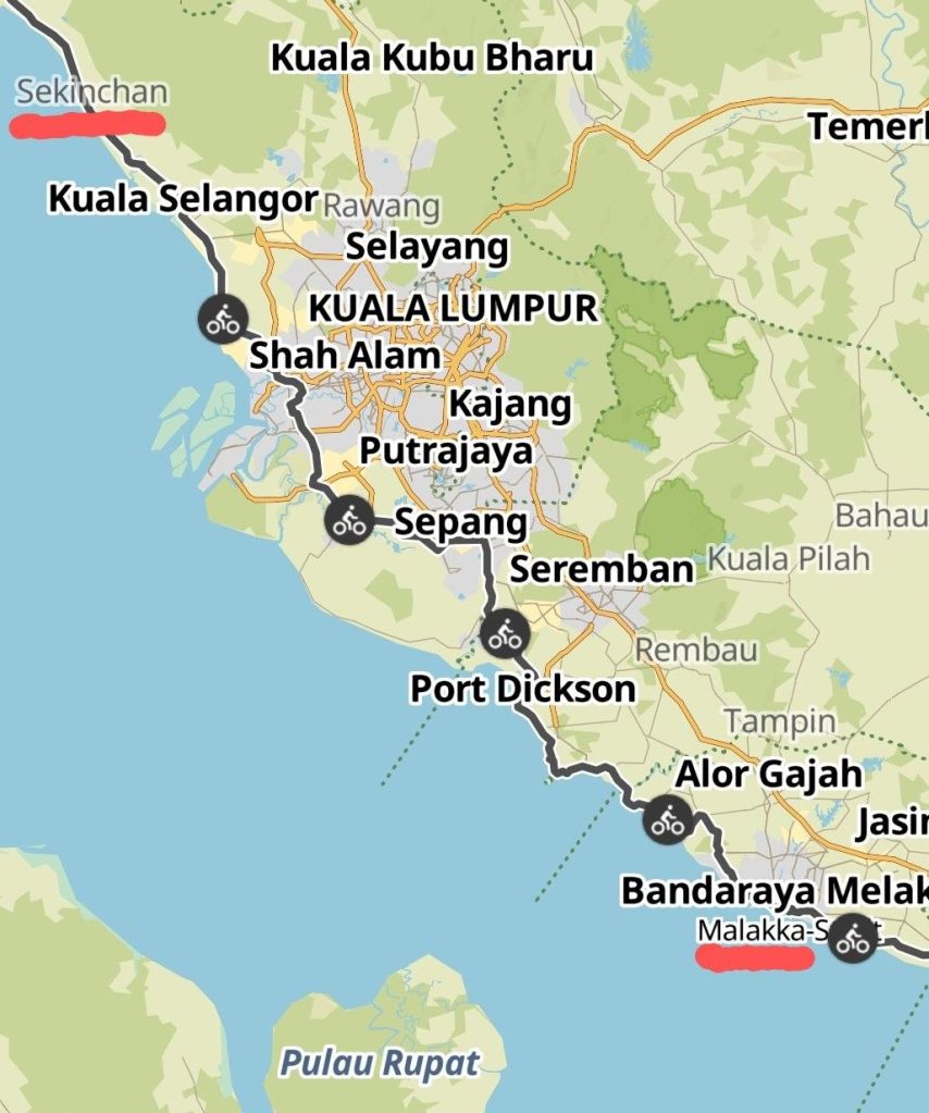 Die ersten 10km bis ich aus Port Dickson heraus war, waren ein dauerndes Stop and Go an jeder Ampel. Von Kilometer 20 bis 50 führte eine sehr gute Strasse durch Palmölplantagen. Es war ein kurviges Auf und Ab. Dabei habe ich im ganzen 300 Höhenmeter überwunden. Ein Nachteil der Palmölplantagen ist für mich, dass es keinen Schatten zum Anhalten gibt. Links und rechts der Strassen hat es einen ca. 20 Meter breiten Grünstreifen mit einem Erdwall, wahrscheinlich damit Unbefugte nicht zu den Plantagen gelangen können. In Sepang angekommen, habe ich das Hotelzimmer bezogen und geduscht. Nachher ist in der ganzen Strasse der Strom für anderthalb Stunden ausgefallen. Zuerst meinte die Rezeptionistin, es dauere wohl zwei bis drei Stunden, Glück gehabt!
