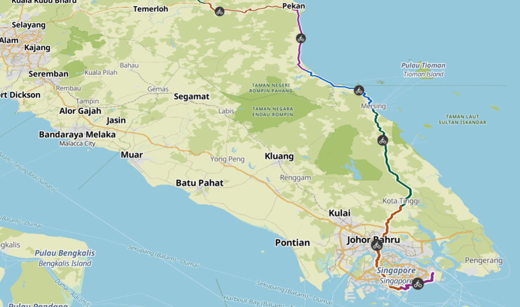 Die Route habe ich mit Komoot und Google Maps grob geplant. Sicher ist, dass ich in Singapur starten werde und dann durch Malaysia nach Thailand reisen will. In Malaysia möchte ich über die Ostküste die Cameron Highlands und Georgetown auf Penang anfahren.